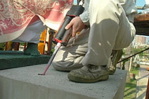 台座とブロンズ像を固定するためにエポキシ樹脂接着剤の充填。